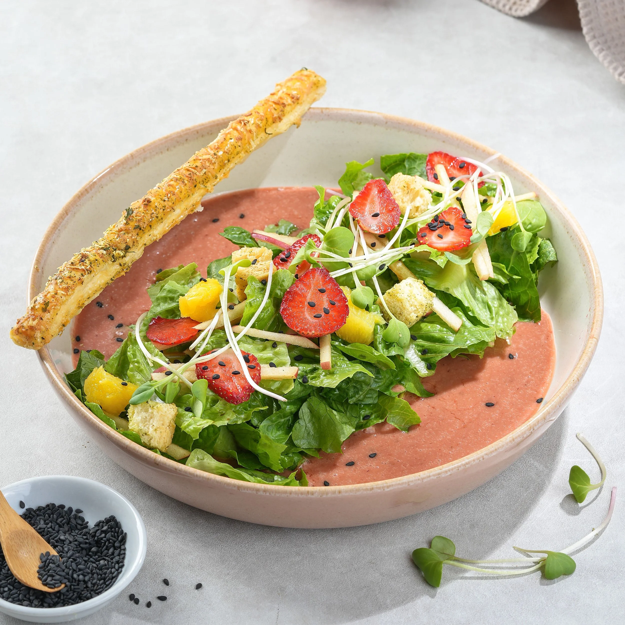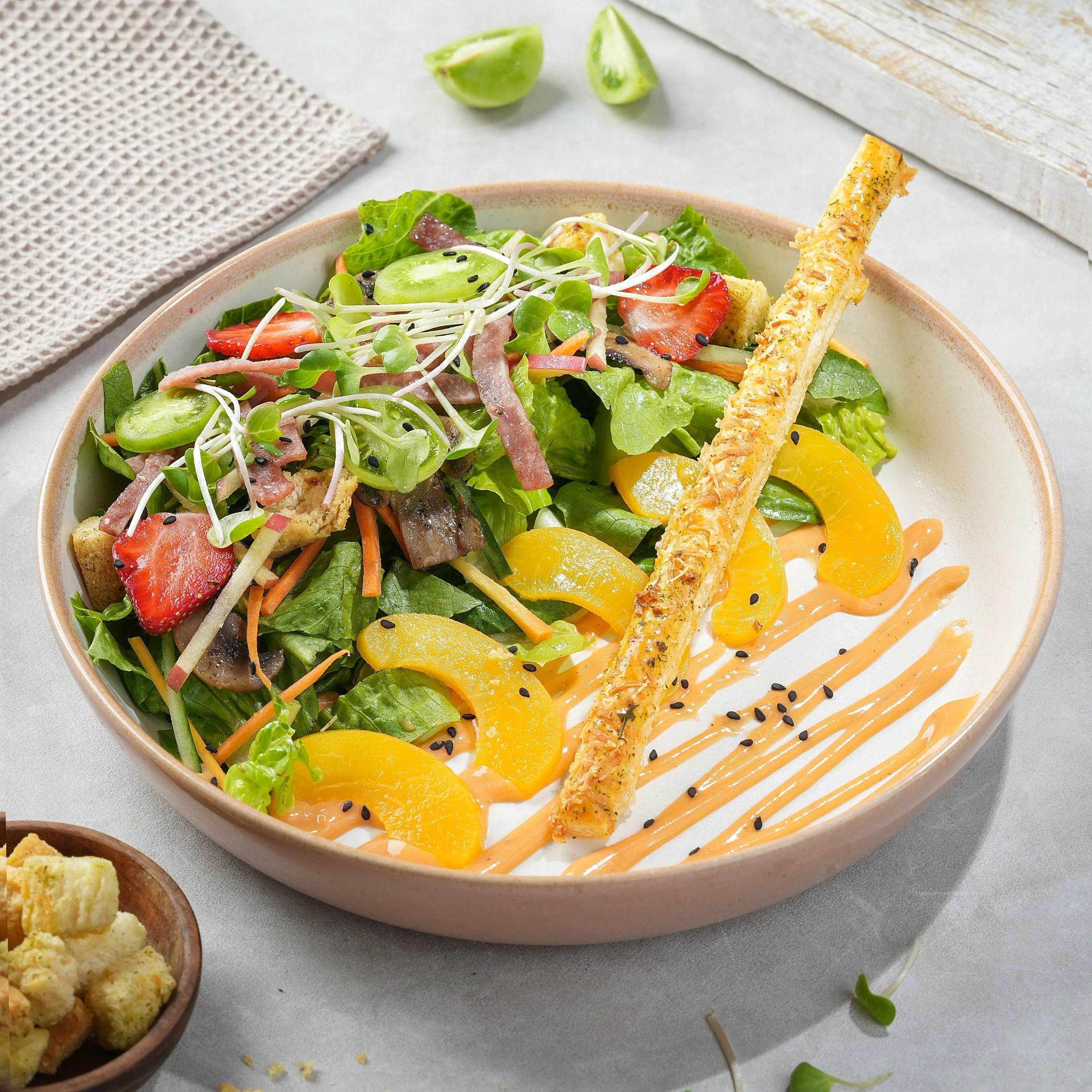 Lettuce, smoked beef, orange, strawberry, apple, cherry tomato, carrot, kyuri, and our special Soomi dressing