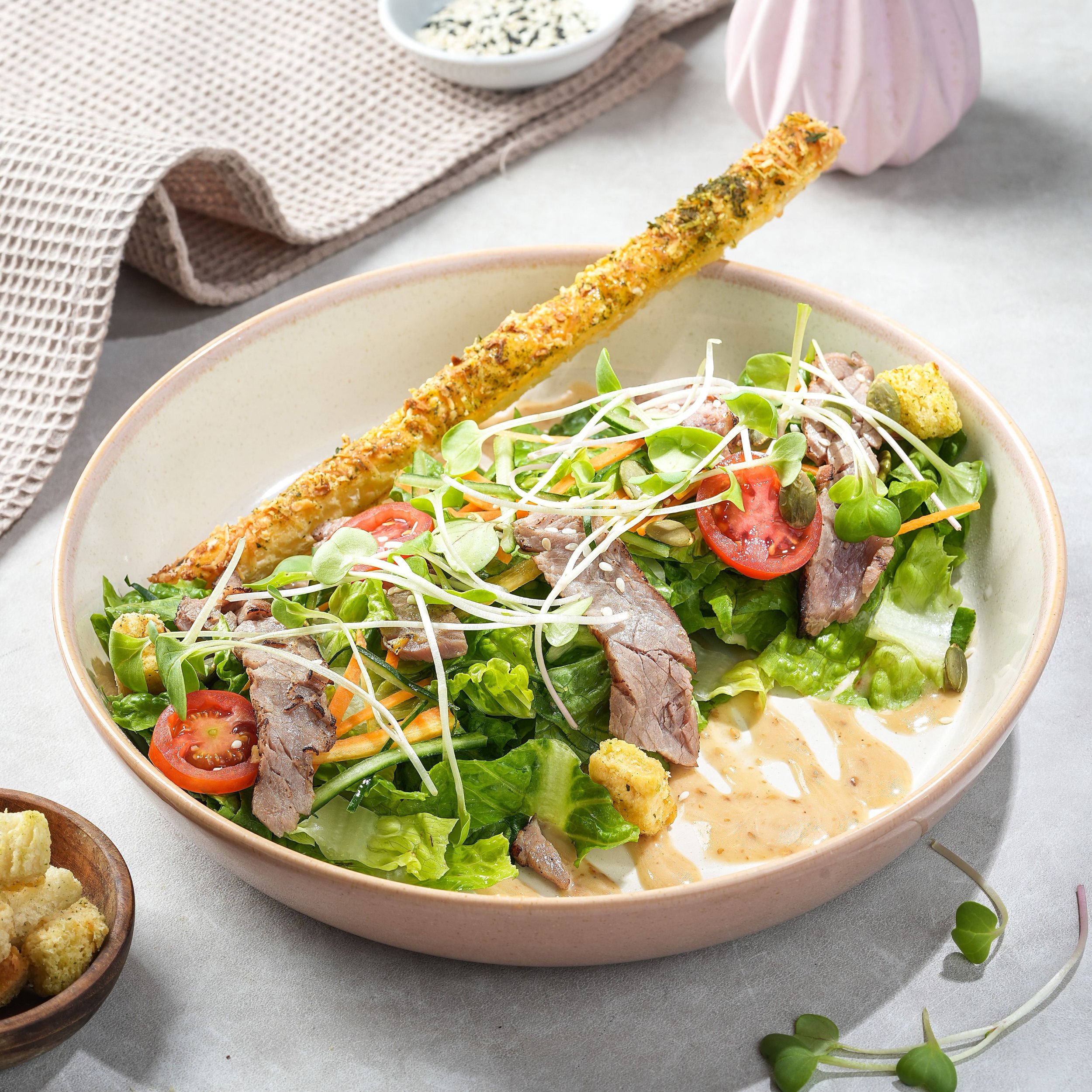 Lettuce, tenderloin beef, carrot, cherry tomato, and sesame dressing